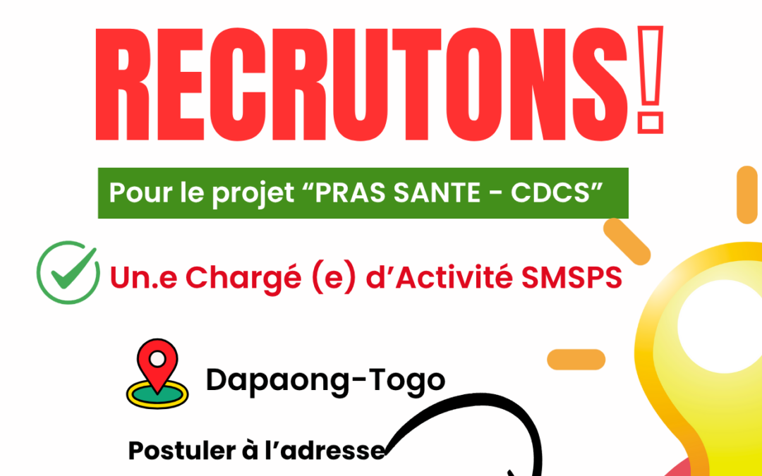 L’Association d’Appui aux Activités de Santé Communautaire (3ASC), en partenariat avec Première Urgence Internationale (PUI), recrute un(e) Chargé(e) d’Activités Santé Mentale et Soutien Psychosocial (SMSPS) pour renforcer ses interventions dans la région des Savanes (Tône, Cinkassé Kpendjal, et Kpendjal-Ouest).