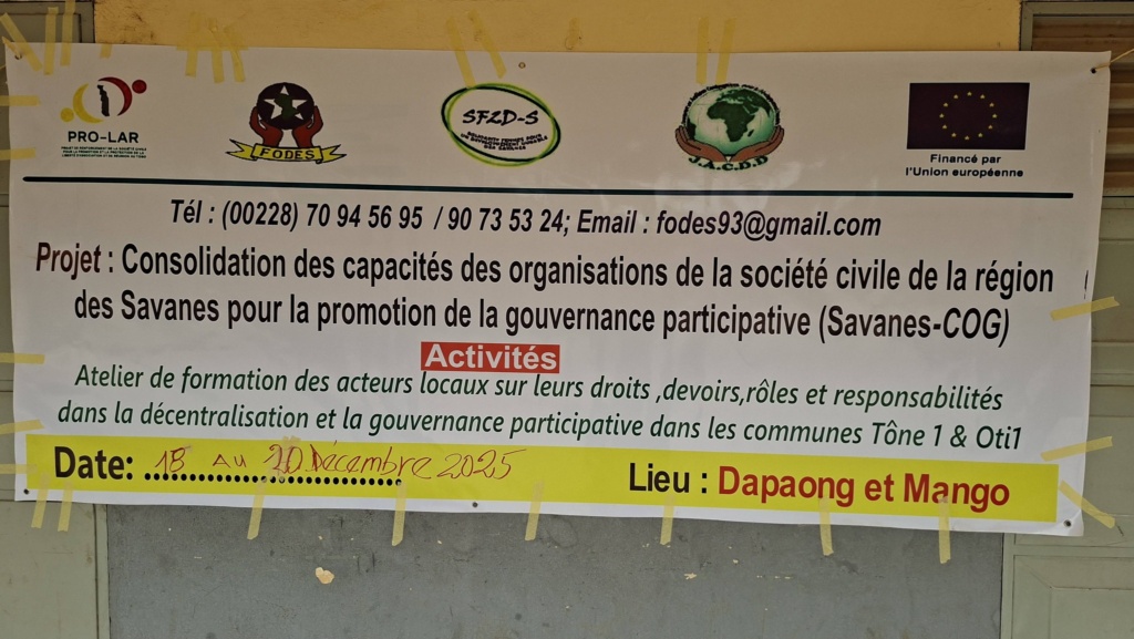 Dapaong, 18 décembre 2025 – L’ONG 3ASC prend part, du 18 au 20 décembre 2025, à Dapaong, à un atelier régional de formation des acteurs locaux organisé par la Fédération des Organisations de Développement de la région des Savanes (FODES), dans le cadre du projet « Consolidation des capacités des organisations de la société civile de la région des Savanes pour la promotion de la gouvernance (Savanes-COG) ».